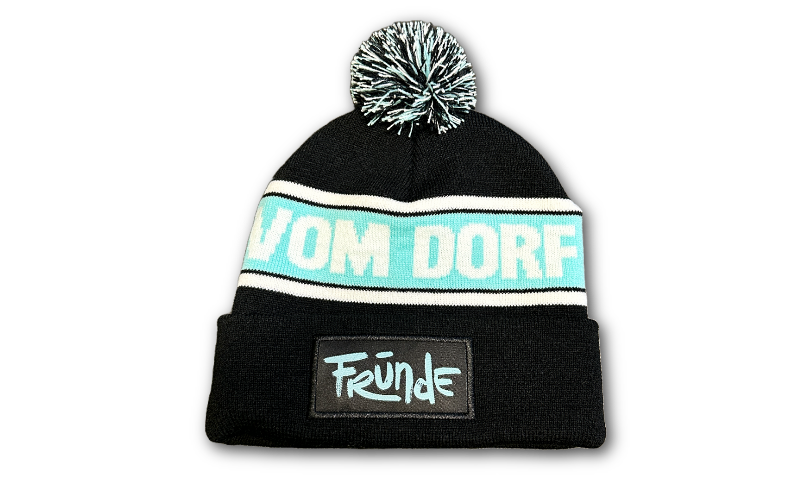 Stylischer Beanie mit Bommel, Fründe-Logo und „Vom Dorf“-Schriftzug – für alle, die ihre Wurzeln mit Stolz tragen.